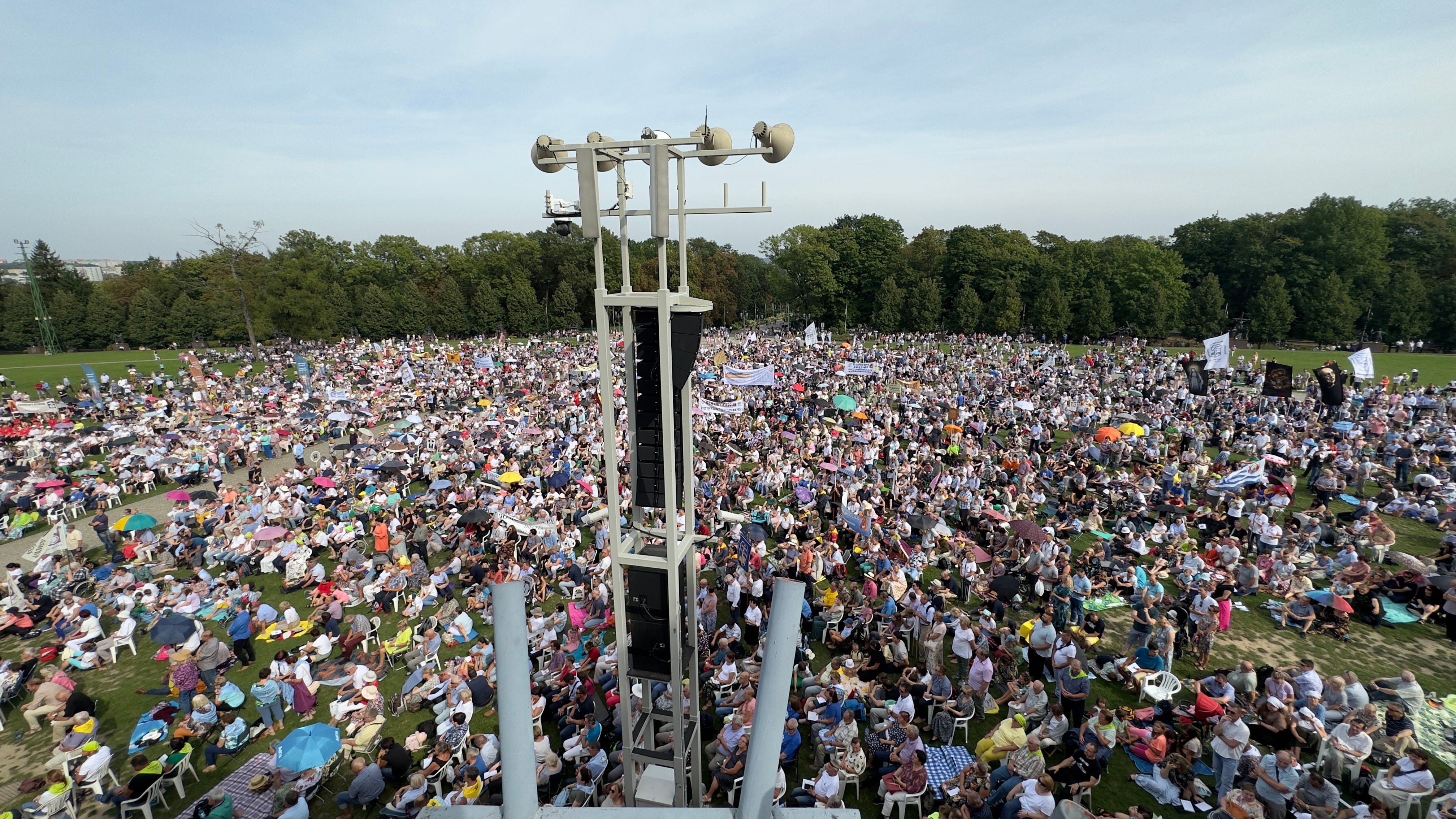 Michael and I sat in white folding chairs on top of the large outdoor dais at Jasna Góra. We were sitting with a small group of other English-speaking visitors from around the world. We all wore little headsets where a Polish translator was translating the Mass into English for us. Far below us on the famous monastery’s great sloping lawn were more than 20,000 people in Domestic Church from all over Europe. The crowd stretched all the way to the distant tree line. Across from where Michael and I sat, at least 200 priests, bishops, and a cardinal or two were seated in their own sea of white folding chairs to concelebrate the Mass.