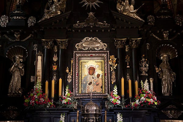 After Mass, Michael and I had the opportunity to visit the chapel at Jasna Gora that houses Our Lady of Częstochowa. The walls of the chapel glittered with jewels, rosaries, and other treasures left by pilgrims who brought Our Lady gifts for favors received by her intercession.